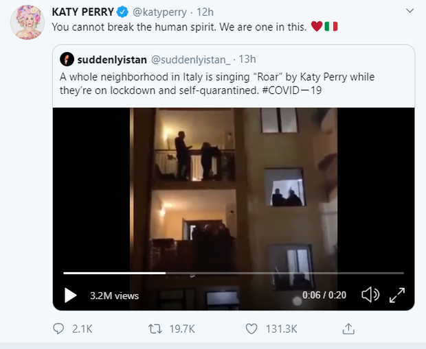 quả thực đoạn clip trên được ghi lại tại một khu chung cư bị cách ly ở Italia, nhưng ca khúc mà hàng trăm người dân đang hát theo chẳng phải là "Roar", mà là bản Quốc ca của nước Ý -"Il Canto degli Italiani". Đoạn clip "fake" phía trên đã được ghép nhạc quá tài tình, nghe cứ như được phát thực sự ở ngoài trời, thế nên đến chính Katy Perry, Madonna, Shawn Mendes,... cũng bị nhầm lẫn! Không biết sắp tới, sẽ còn những "nạn nhân" nào nữa đây?